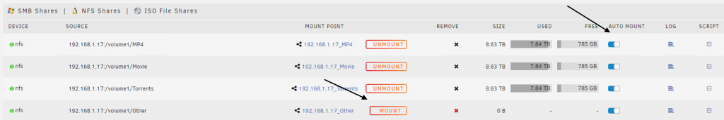 然后点击MOUNT按钮,挂载,记得打开auto mount,如果不显示容量和剩余空间,就重启一下UNRAID。