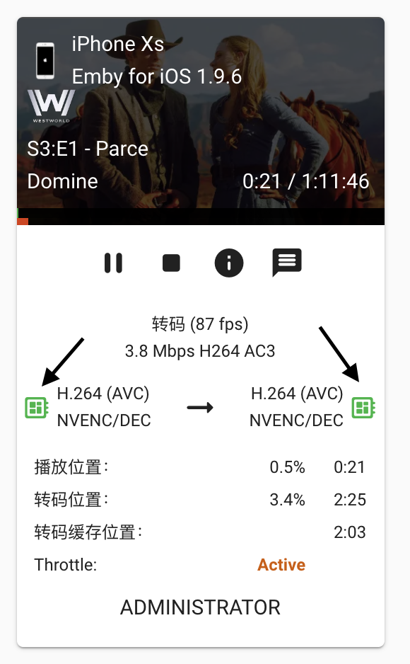 启用硬件转码之后,转码界面会出现这两个绿色小图标,证明已经启用硬件加速。